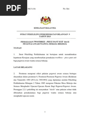 Kerajaan Malaysia Surat Pekeliling Perkhidmatan Bilangan 9 Tahun 2013 Pemakaian Two Three Piece Pant Suit Bagi Pegawai Awam Wanita Semasa Bekerja Tujuan