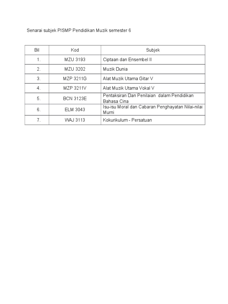 Senarai Subjek Pismp Pendidikan Muzik Semester 6