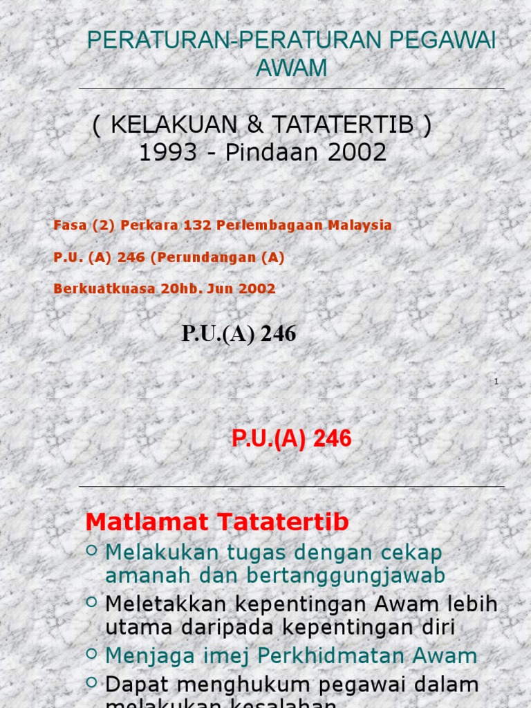Peraturan peraturan pegawai awam kelakuan dan tatatertib 1993 pindaan 2002. Penglibatan pegawai dalam koperasi pp bil 9 1995. Peraturan peraturan pegawai awam kelakuan dan tatatertib 1993. Peraturan peraturan pegawai awam kelakuan dan tatatertib 1993. Peraturan pegawai awam kelakuan dan tatatertib 1993 p u a 395 1993 yang mula berkuatkuasa pada 15 disember 1993 menggantikan perintah perintah am pegawai awam kelakuan dan tatatertib bab d 1980.