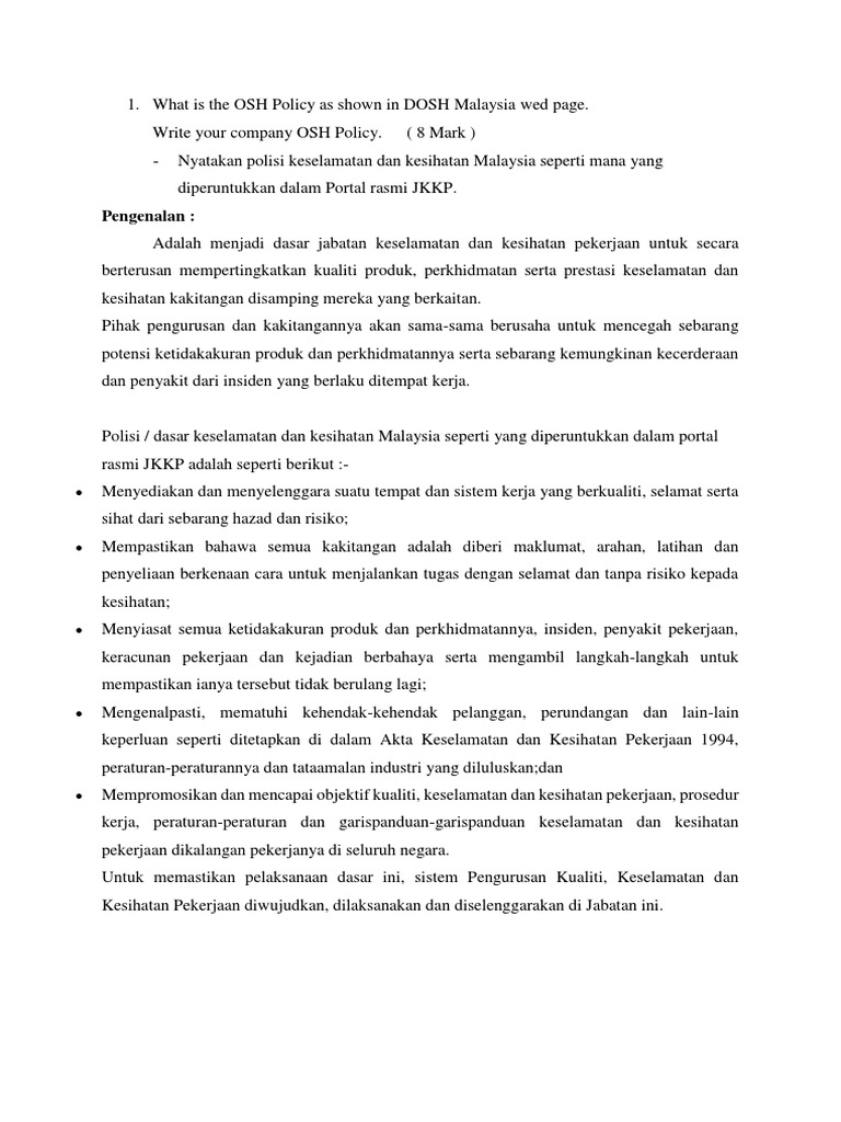 Jabatan bertanggungjawab untuk memastikan keselamatan kesihatan dan kebajikan orang yang sedang bekerja dan melindungi orang lain daripada bahaya bahaya keselamatan dan kesihatan yang berpunca daripada aktiviti pekerjaan pelbagai sektor iaitu. Keselamatan kualiti makanan. Profesional keselamatan dan kesihatan peguam wakil dari agensi kerajaan universiti pertubuhan majikan dan kesatuan sekerja pandangan dari jabatan keselamatan dan kesihatan pekerjaan jkkp juga diperolehi sepanjang proses ini segala bantuan dan kerjasama daripada mereka yang terlibat dalam penyediaan garis panduan ini adalah amat dihargai. Pelaksanaan transformasi projek pembangunan sistem keselamatan dan kesihatan pekerjaan mykkp jabatan keselamatan dan kesihatan pekerjaan jkkp page 5 of 28 bil.