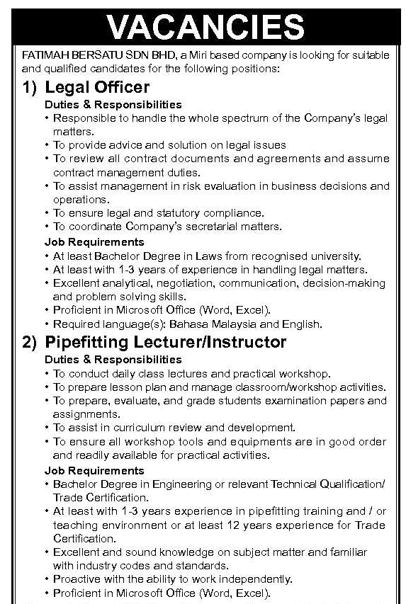 Oil Gas Vacancies Vacancies Fatimah Bersatu Miri