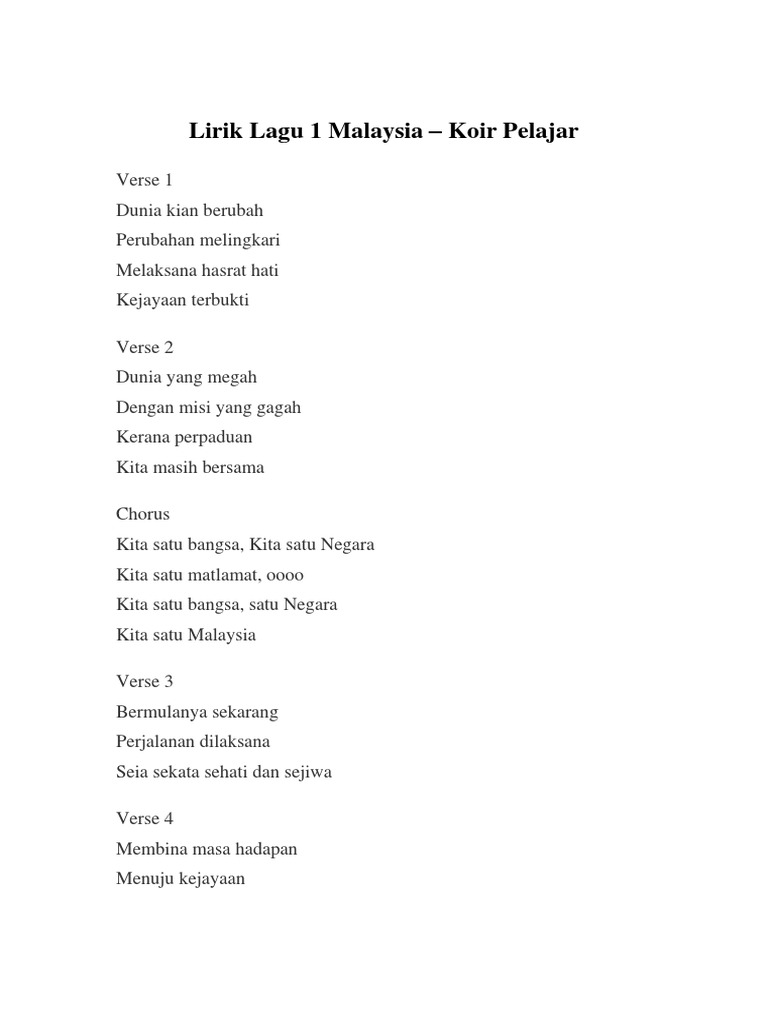Lirik Lagu Satu 1 Malaysia Koir Pelajar Verse 1 Lirik Lagu Satu 1 Malaysia Koir Pelajar Verse 1