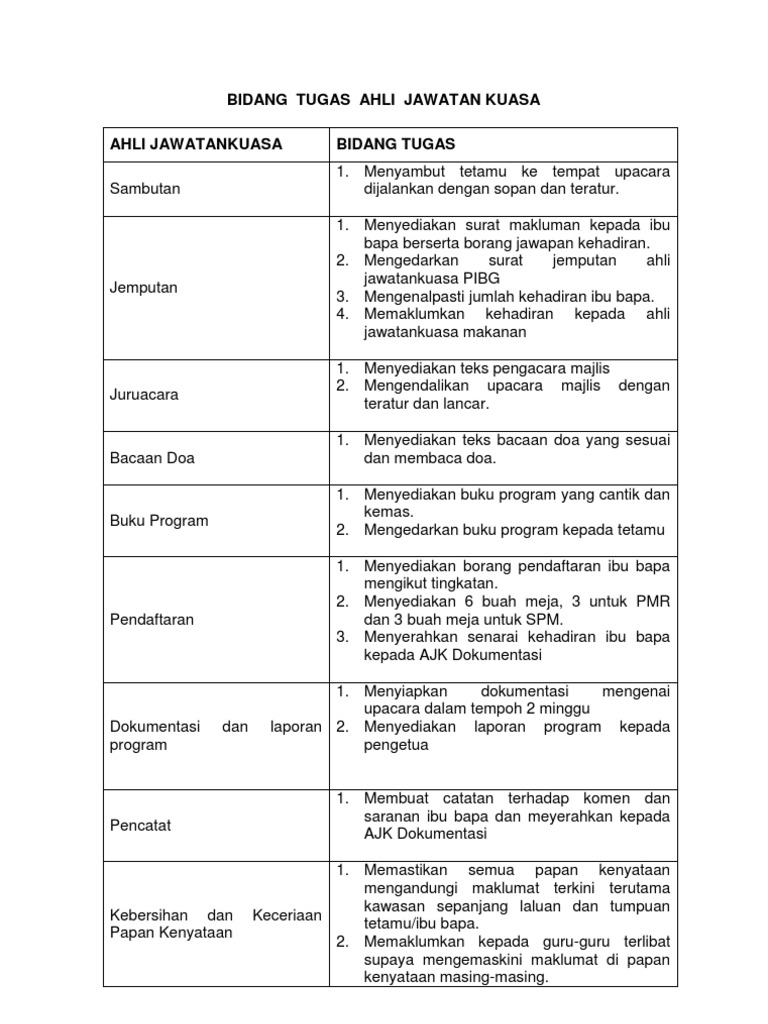 Senarai Tugas Ahli Jawatankuasa
