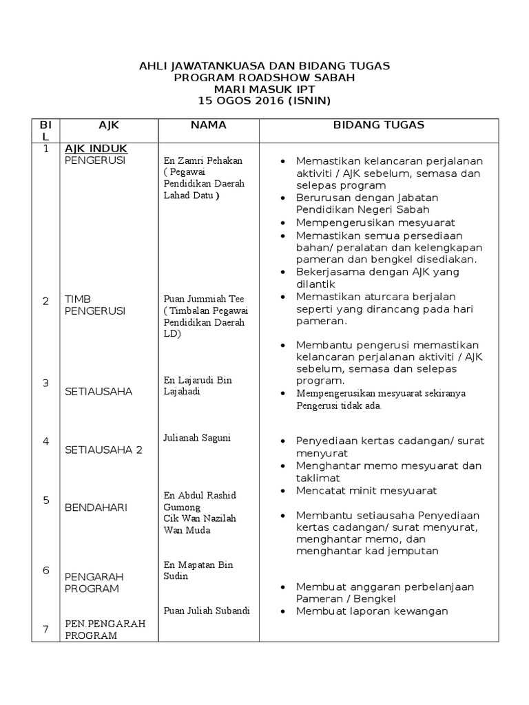 Senarai Tugas Ahli Jawatankuasa Program