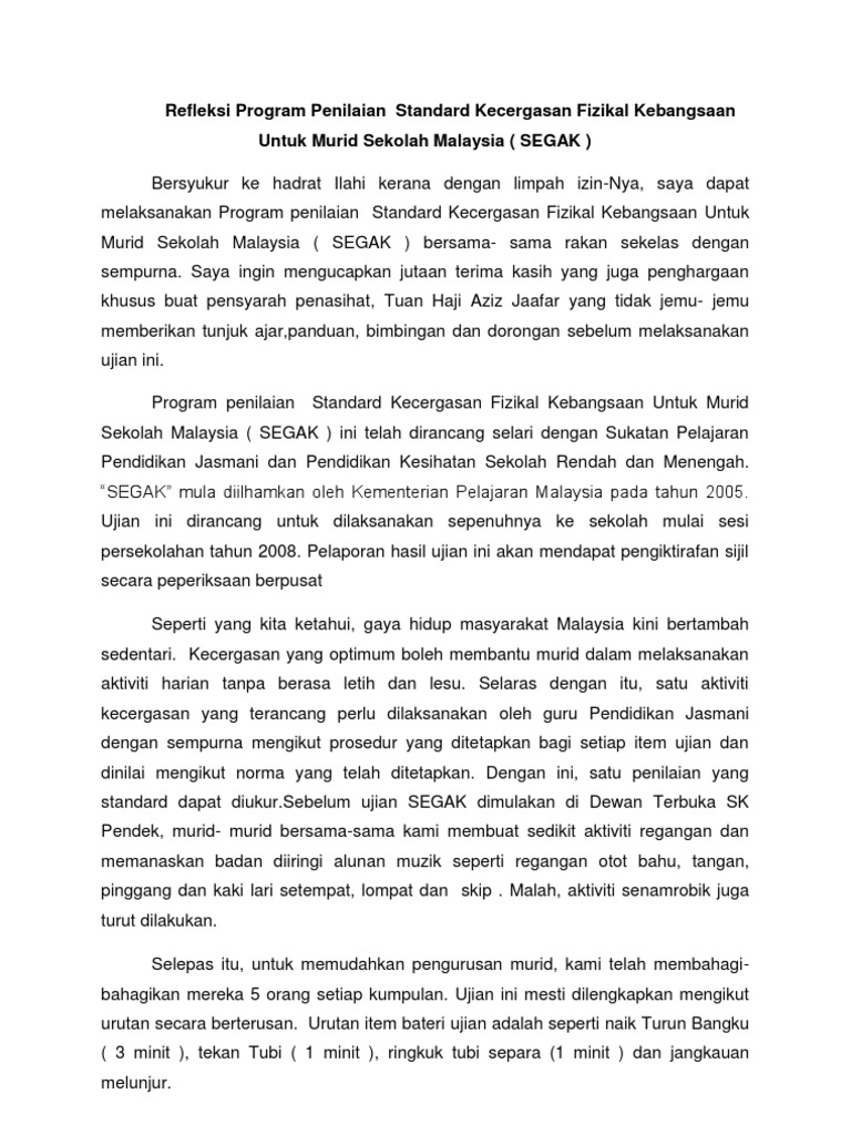 Refleksi Program Penilaian Standard Kecergasan Fizikal Kebangsaan Untuk Murid Sekolah Malaysia