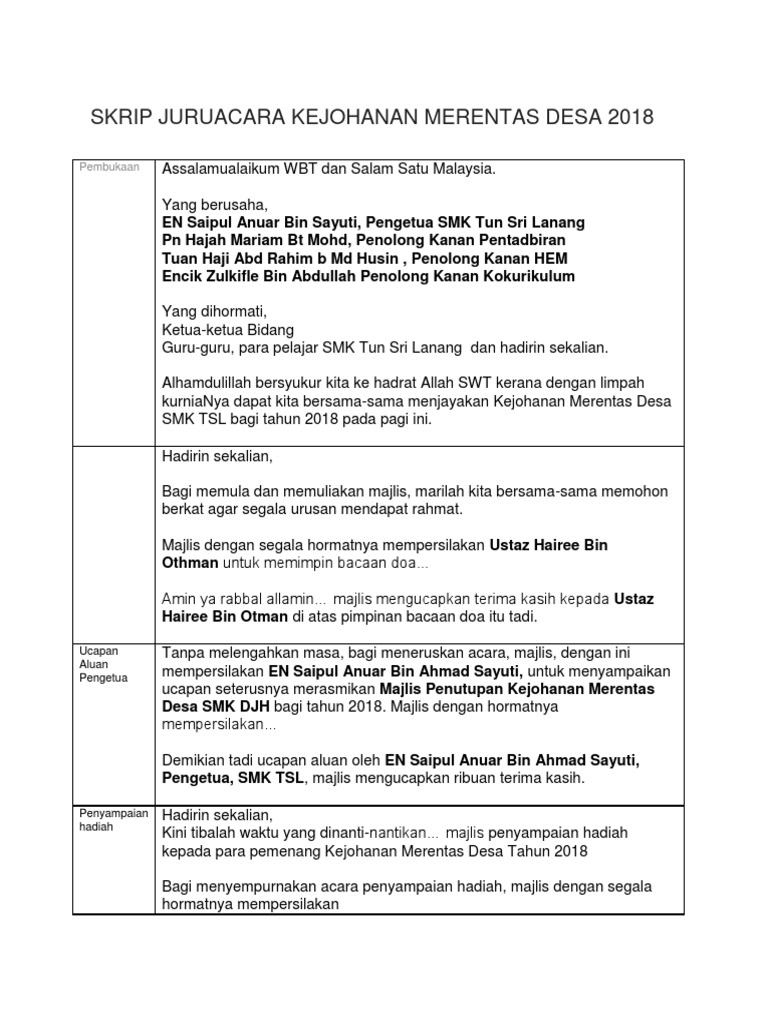 Skrip Juruacara Kejohanan Merentas Desa 2018