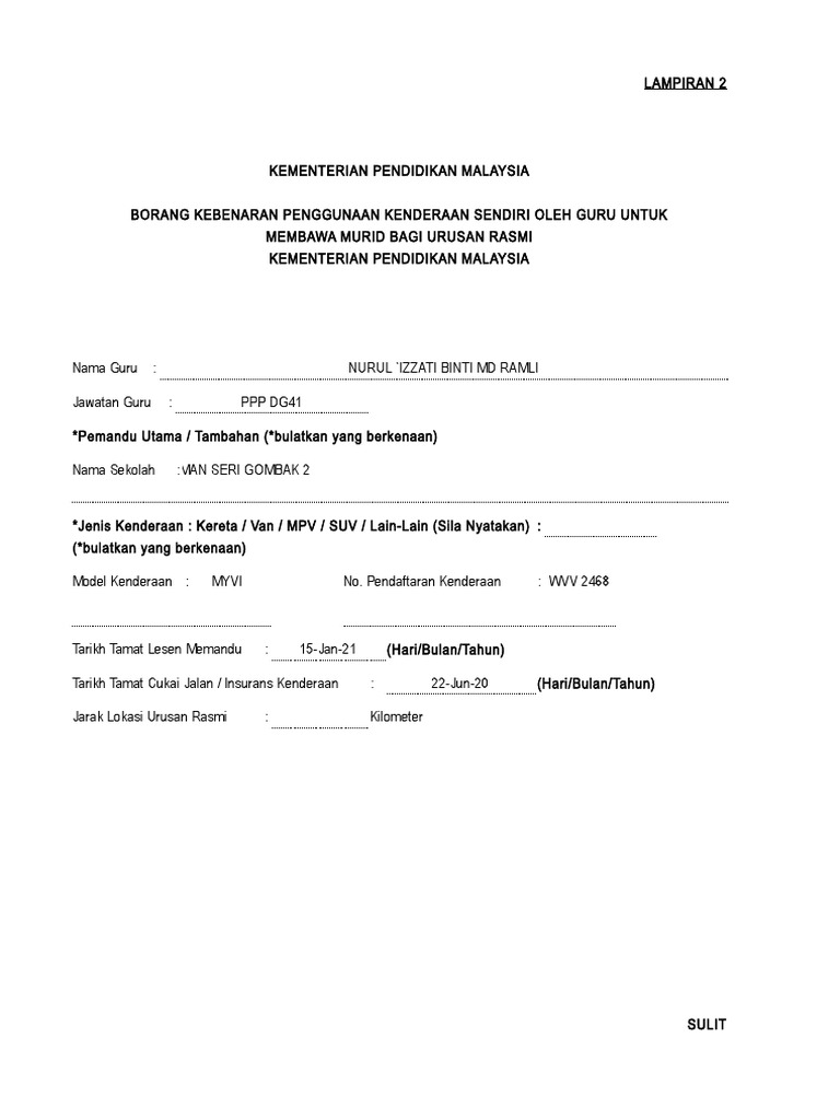 Borang Kebenaran Menggunakan Kenderaan Sendiri