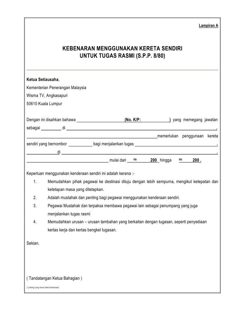 Surat kebenaran menggunakan kenderaan sendiri. Menumpang kereta pegawai lain sila sebutkan nama dan tempat bertugas pegawai 6 jika tidak menaiki keretapi kapal terbang kerana menggunakan kenderaan sendiri sila nyatakan sebab sebabnya. Elaun bagi yang kemudahan perjalanan kemudahan menuntut kenderaan pegawai menggunakan bukan kenderaan sendiri semasa menjalankan tugas rasmi. Peraturan meluluskan elaun perjalanan kenderaan kelas c pegawai bergaji kurang rm 820 00 sekarang rm 1193 54. Pelan strategik kokurikulum 2018 2020.