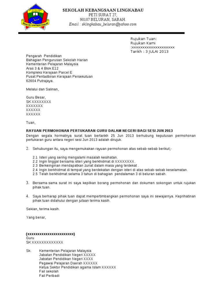 Contoh Surat Sokongan Pertukaran Dari Guru Besar Surat Guru Belajar