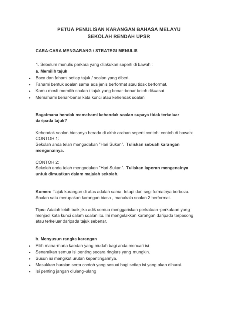 Petua Penulisan Karangan Bahasa Melayu Sekolah Rendah Upsr