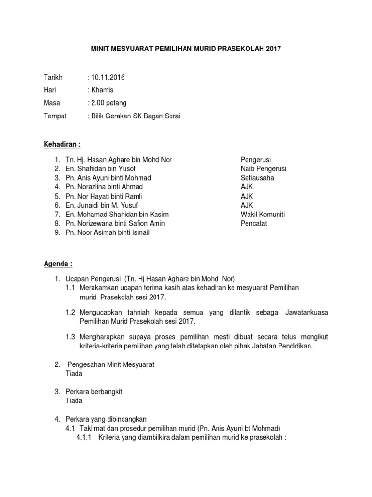 Minit Mesyuarat Pemilihan Prasekolah