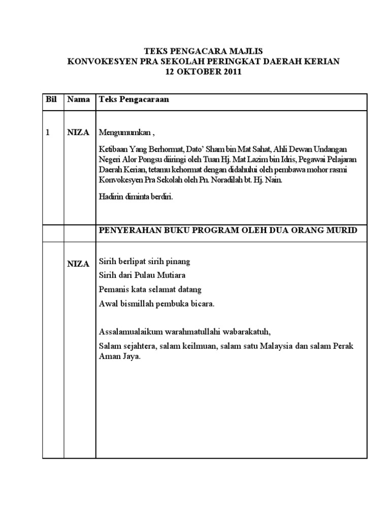 Teks Pengacara Majlis Anugerah Kecemerlangan Dan Graduasi Prasekolah