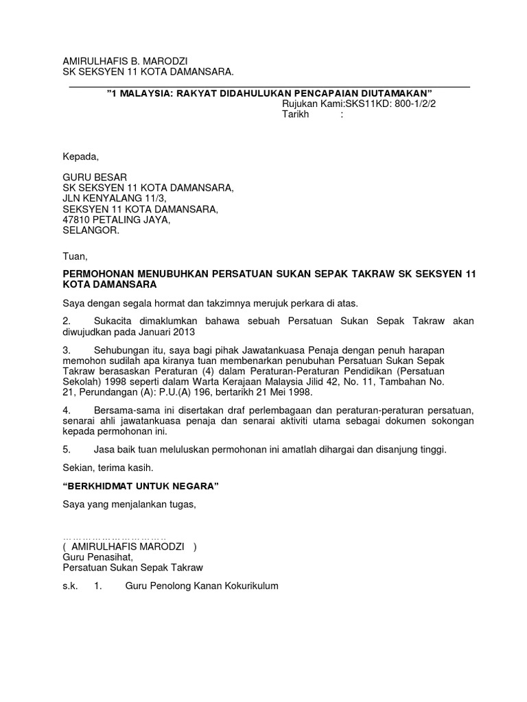 Contoh Surat Mohon Penubuhan Kelab