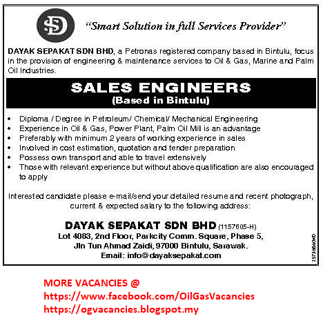 Oil Gas Vacancies Sales Engineer Dayak Sepakat Bintulu