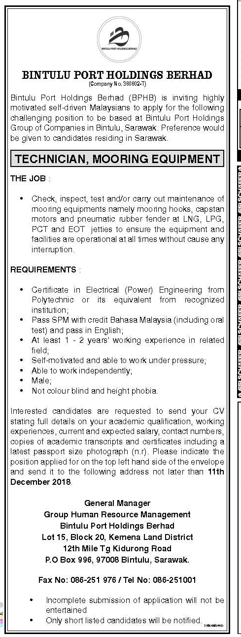 Vacancy In Bintulu 2018