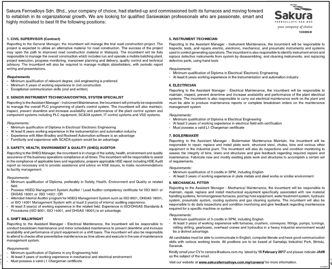 Oil Gas Vacancies Vacancies Sakura Ferroalloys Bintulu